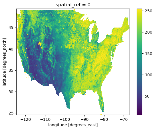 ndvi = rioxarray.open_rasterio("MOD_NDVI_M_2018-06-01_rgb_3600x1800.TIFF")ndvi_us = ndvi.rio.clip(us_boundary.to_crs(ndvi.rio.crs).geometry) # Matching CRS and cliping to study areandvi_us = ndvi_us.drop_vars("band").squeeze() # Getting rid of redundant dimensionndvi_us = ndvi_us.where(ndvi_us>0) # Filtering null valuesprint(f"Raster CRS: {ndvi_us.rio.crs}") # Check the CRS to see if it's in degrees (4326) or meters