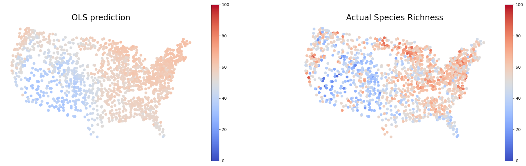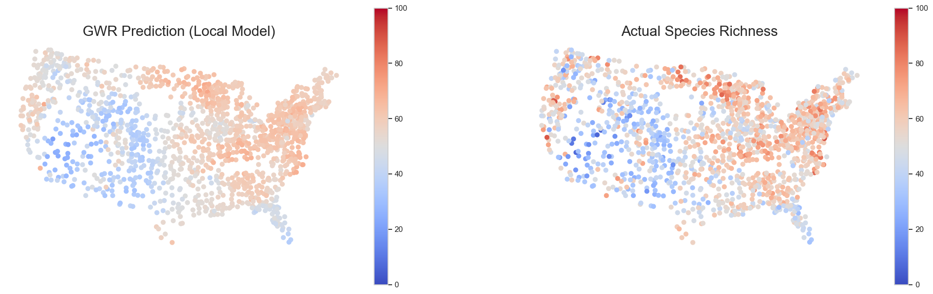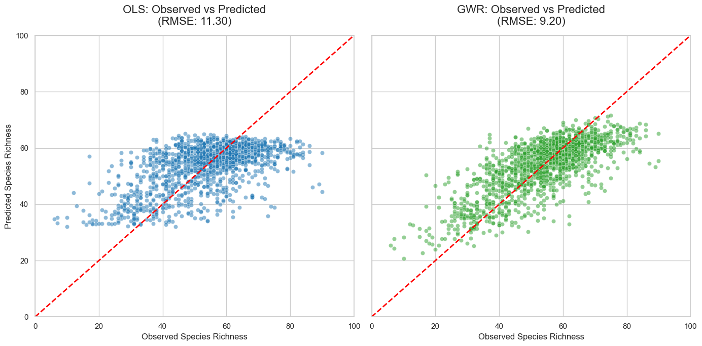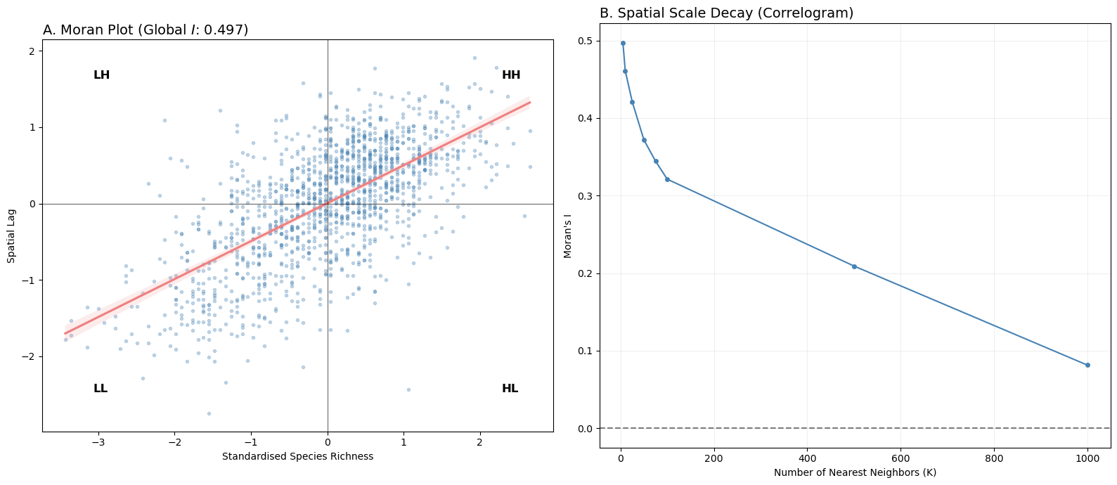 Evaluate global and local spatial autocorrelation in species richness and model residuals.